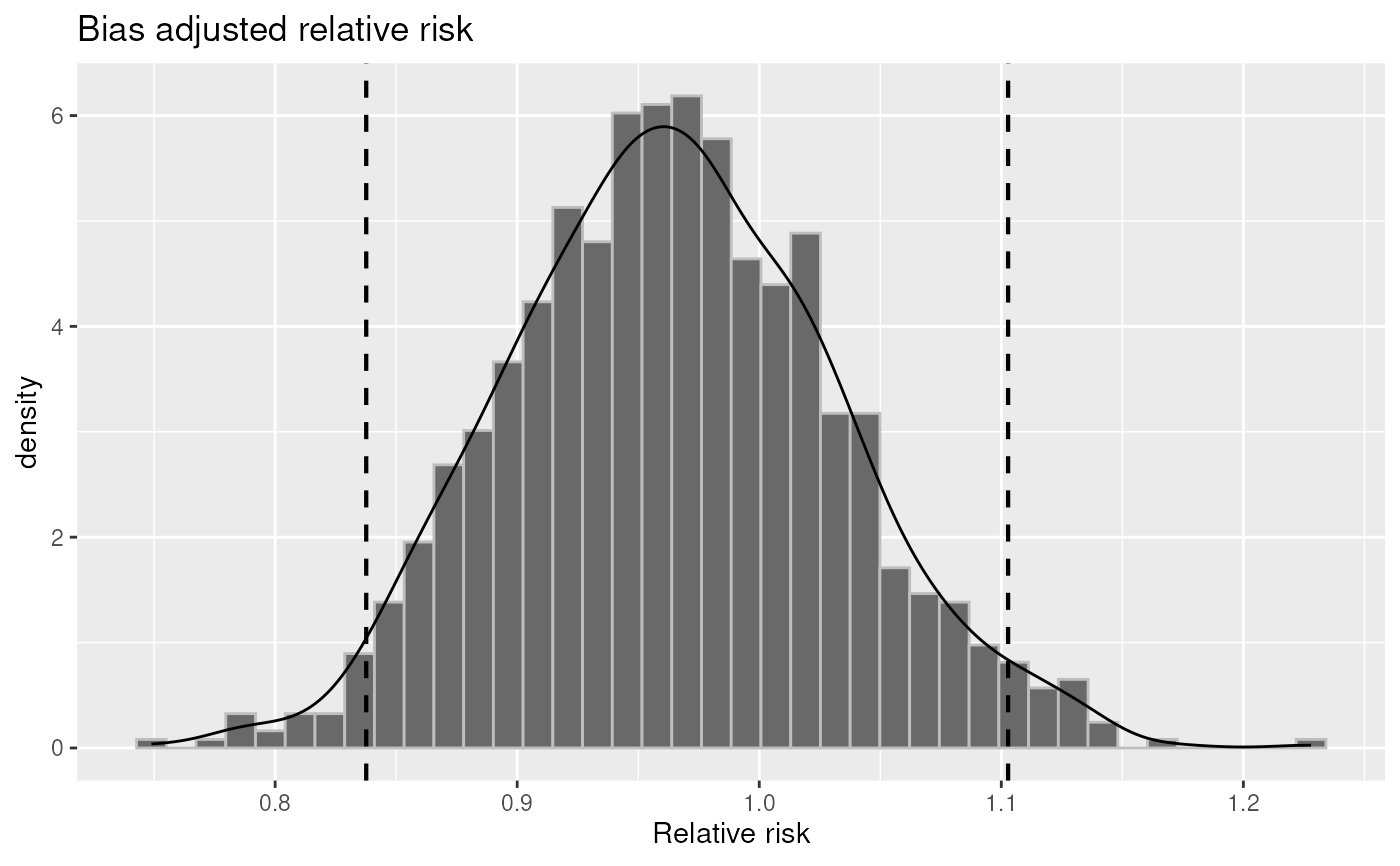 plot.episensr_booted.RdThis takes an episensr bootstrap object and produces the plot of bootstrap replicates for selection or misclassification bias of the variable of interest, either relative risk or odds ratio. It also draws the confidence interval.